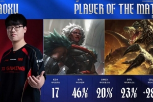 体育资讯4月29日讯 JDG今日干净利落横扫NIP,小徐连续两把发挥重要作用,首局他的安蓓萨在关键团战中精准逮捕Assum帮助队伍奠定胜局,次局又是他的鳄鱼多次绕后力保队友赢下团战,他以场均46%的参团率与23%的承伤占比当选本场比赛最佳选手。