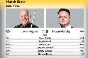 上半场肖恩·墨菲打出一杆破百(100)和两杆50+(68、69),上半场结束,墨菲以3-1的比分暂时领先约翰·希金斯。